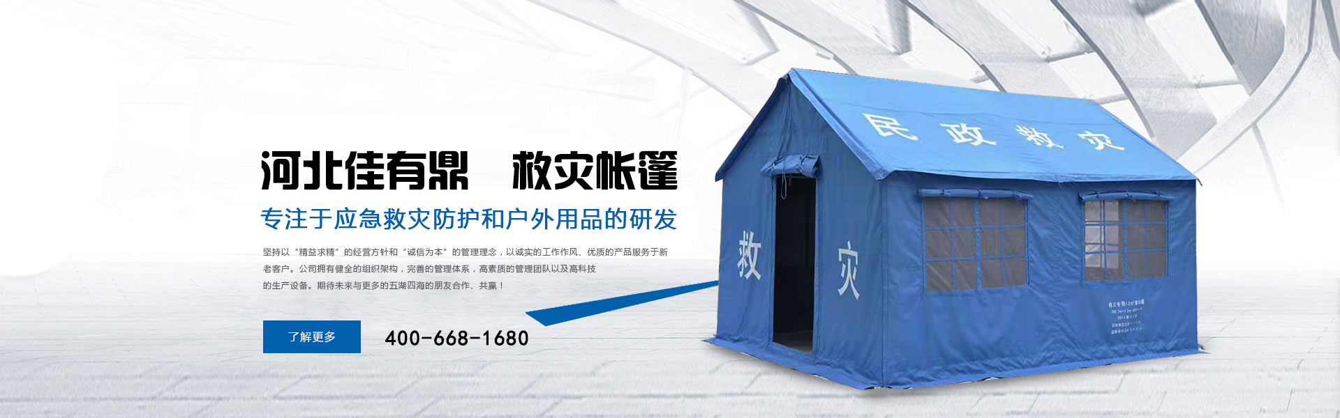 河北佳有鼎科技有限公司原為北京五環(huán)精誠帳篷有限責任公司多年來專注于應急救災防護和戶外用品的研發(fā),是一家集研發(fā)、設計、生產(chǎn)、銷售、服務于一體的綜合型公司。